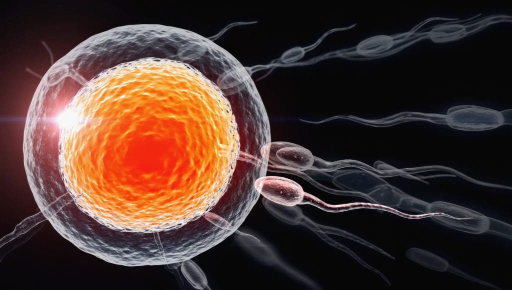 Photo: A detailed 3D-rendered image of sperm cells approaching an egg cell in a microscopic biological reproduction process. Credit: Canva