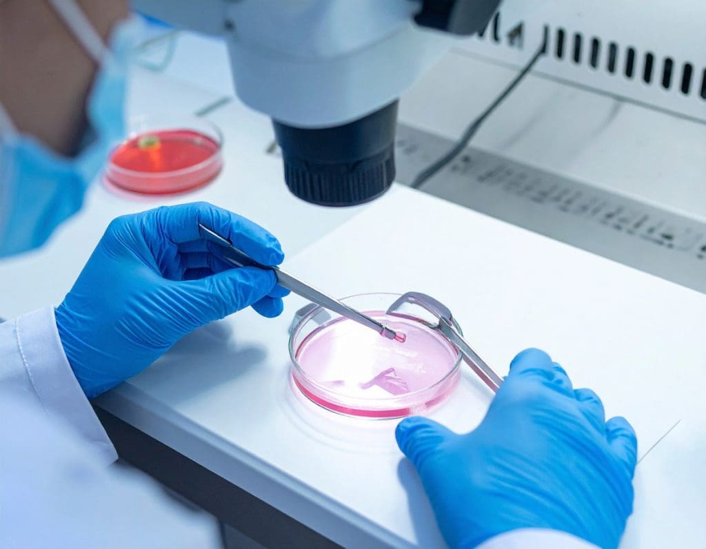 Photo: Fertility lab with a scientist handling a petri dish under a mic. Credit: Canva